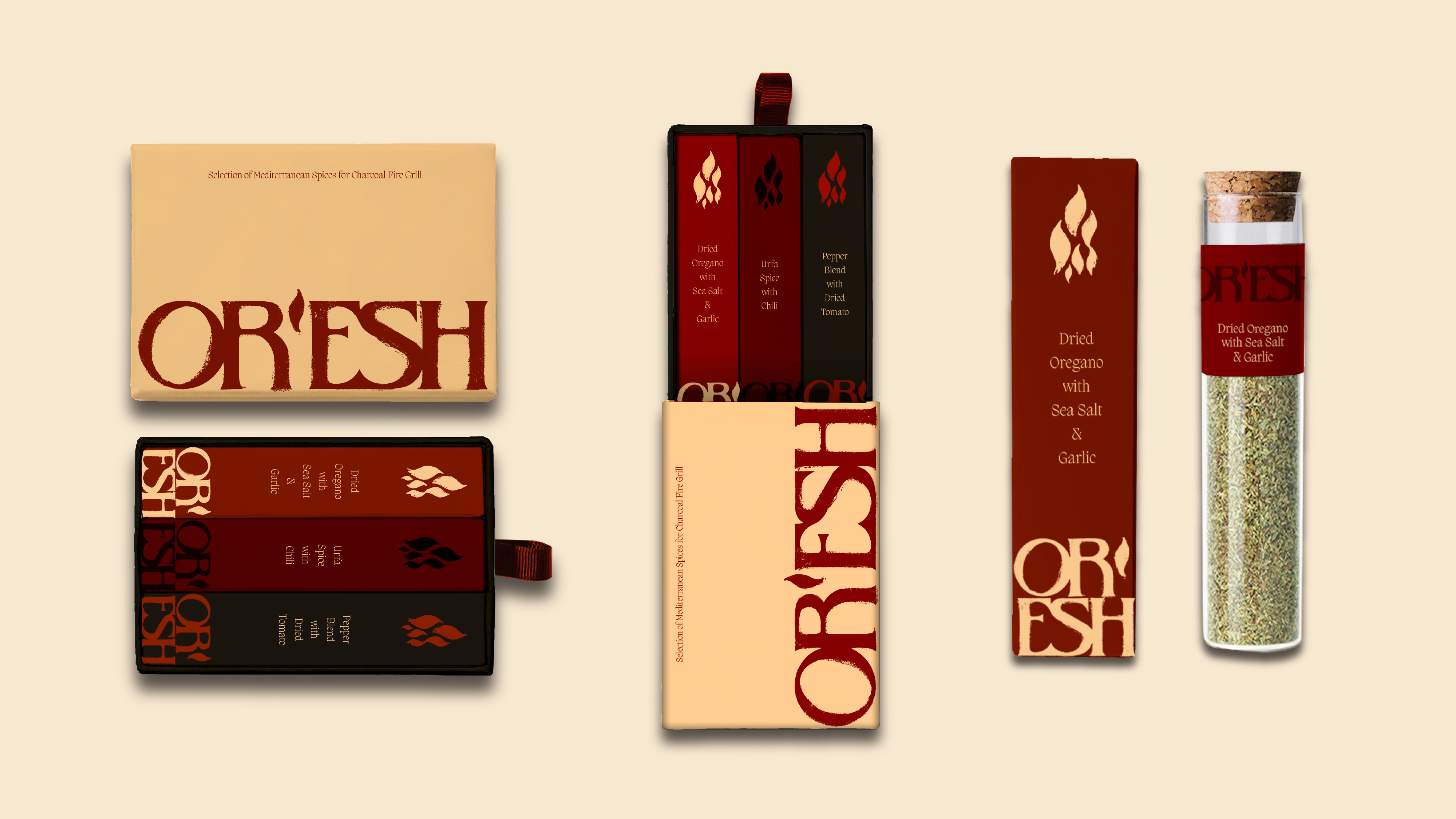The goal was to create a visual identity that embodies the essence of light and fire. The entire system is rooted in the sensory experience of flame and charcoal cooking, with colors derived from fire, ash, charcoal, and butter. Every element of the identity was designed to feel warm, grounded, and cohesive, forming a direct connection between the wood-fired culinary philosophy and the visual language.Particular emphasis was placed on the menu, as OR’ESH is positioning itself for Michelin recognition. The identity needed to support that ambition through detailed, bespoke collateral elements that elevate the presentation of the cuisine. The objective was to unify fire-charred technique and refined design into one singular, consistent entity, delivering a clear and powerful message to guests through every touchpoint.